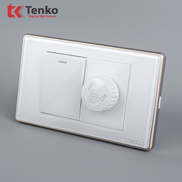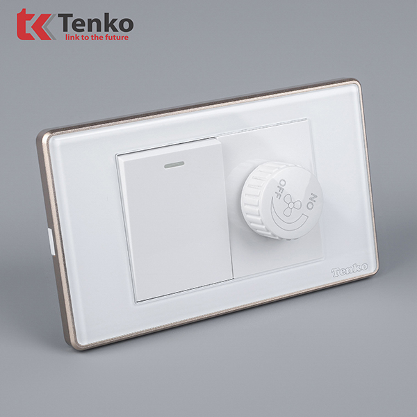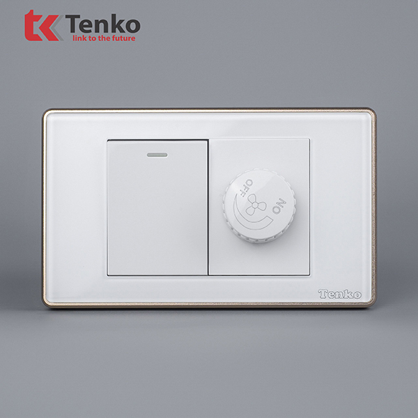 Chiết Áp Quạt Âm Tường+Công Tắc Mặt Kính Cường Lực Cao Cấp TENKO TK-C18W-087 Trắng Viền Vàng