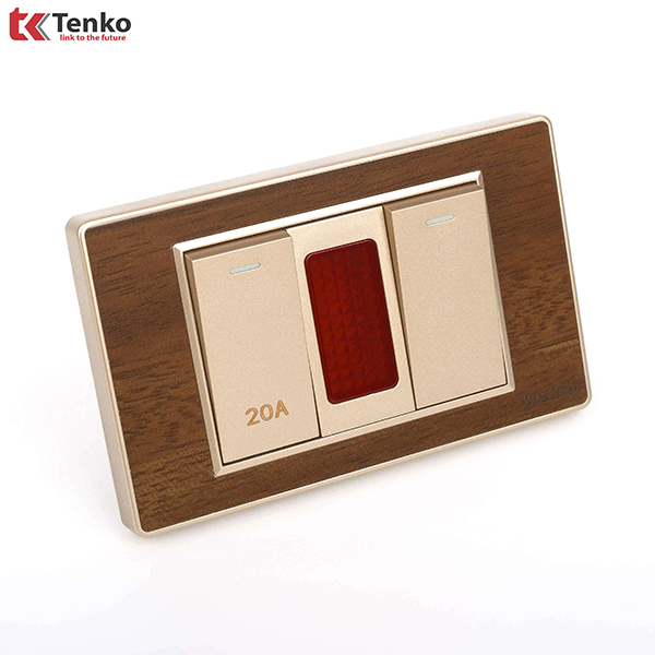Bộ Công Tắc 2 Cực 20A Cho Điều hoà hoặc Bình Nóng Lạnh Mặt vân gỗ. Với sự kết hợp giữa tính thẩm mỹ và tinh tế với các đường vân gỗ kết hợp với bo viền vàng. Biến sản phẩm trở nên tinh tế phù hợp với mọi không gian đặc biệt là không gian biệt thự nhà Gỗ.