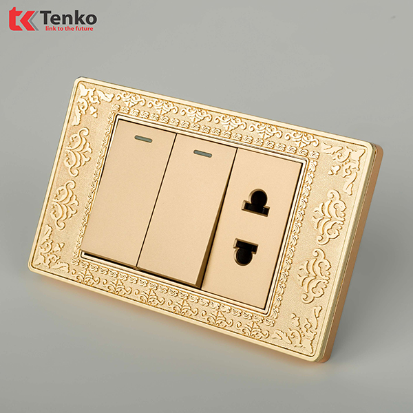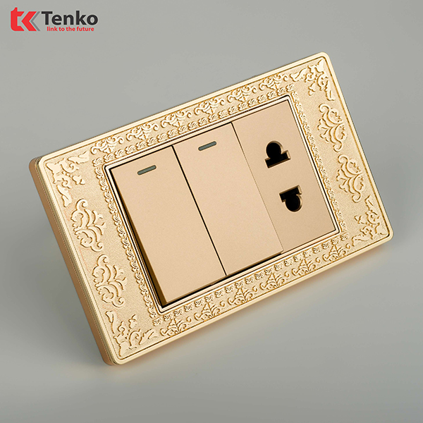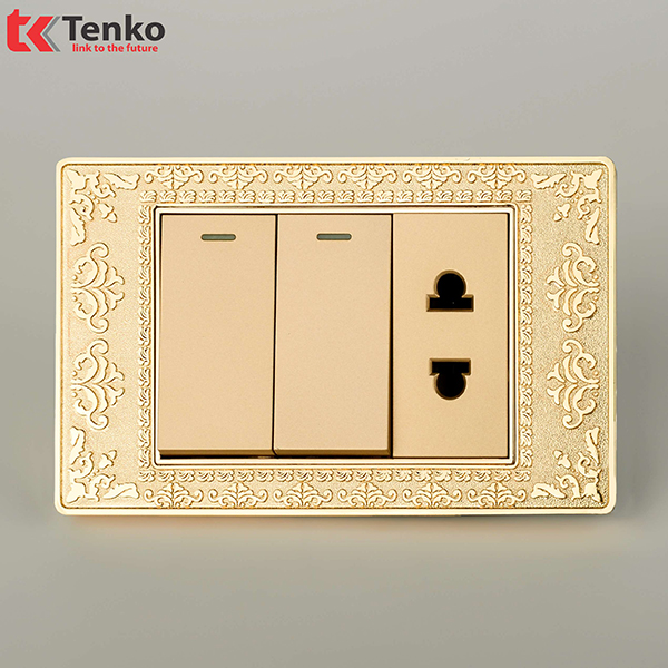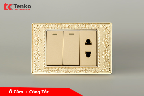 Công Tắc 2 Nút Và Ổ Cắm Đôi Âm Tường Mặt Hoa Văn Đồng Nguyên Khối TENKO TK-C8-027
