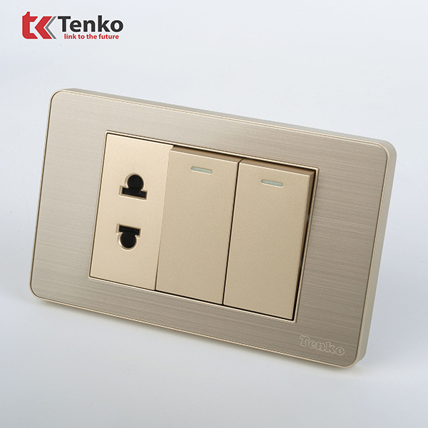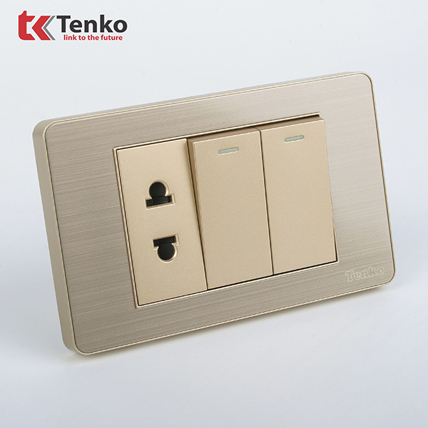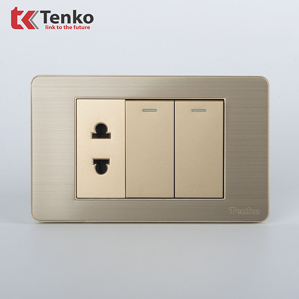 Công Tắc 2 Nút Và Ổ Cắm Đôi Âm Tường Mặt Hợp Kim Bo Viền Màu Vàng TENKO TK-C7G-027