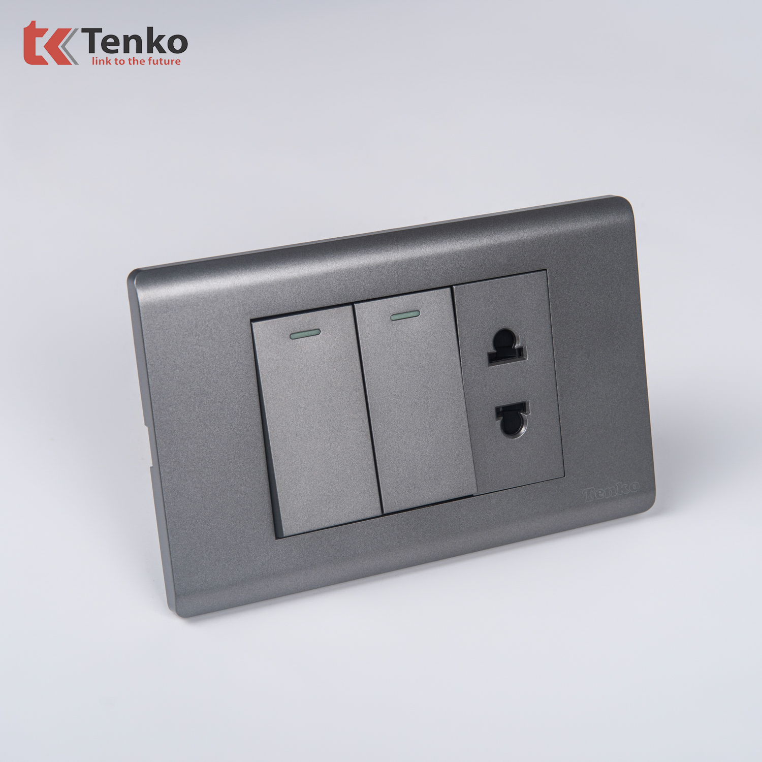 Công Tắc 2 Nút Và Ổ Cắm Đôi Âm Tường TENKO TK-C25-027 Mặt Nhựa PC Xám