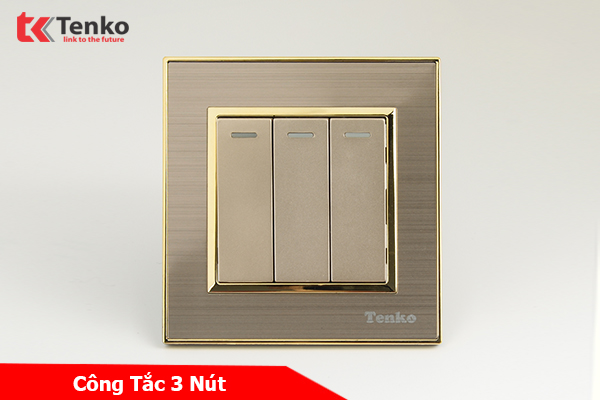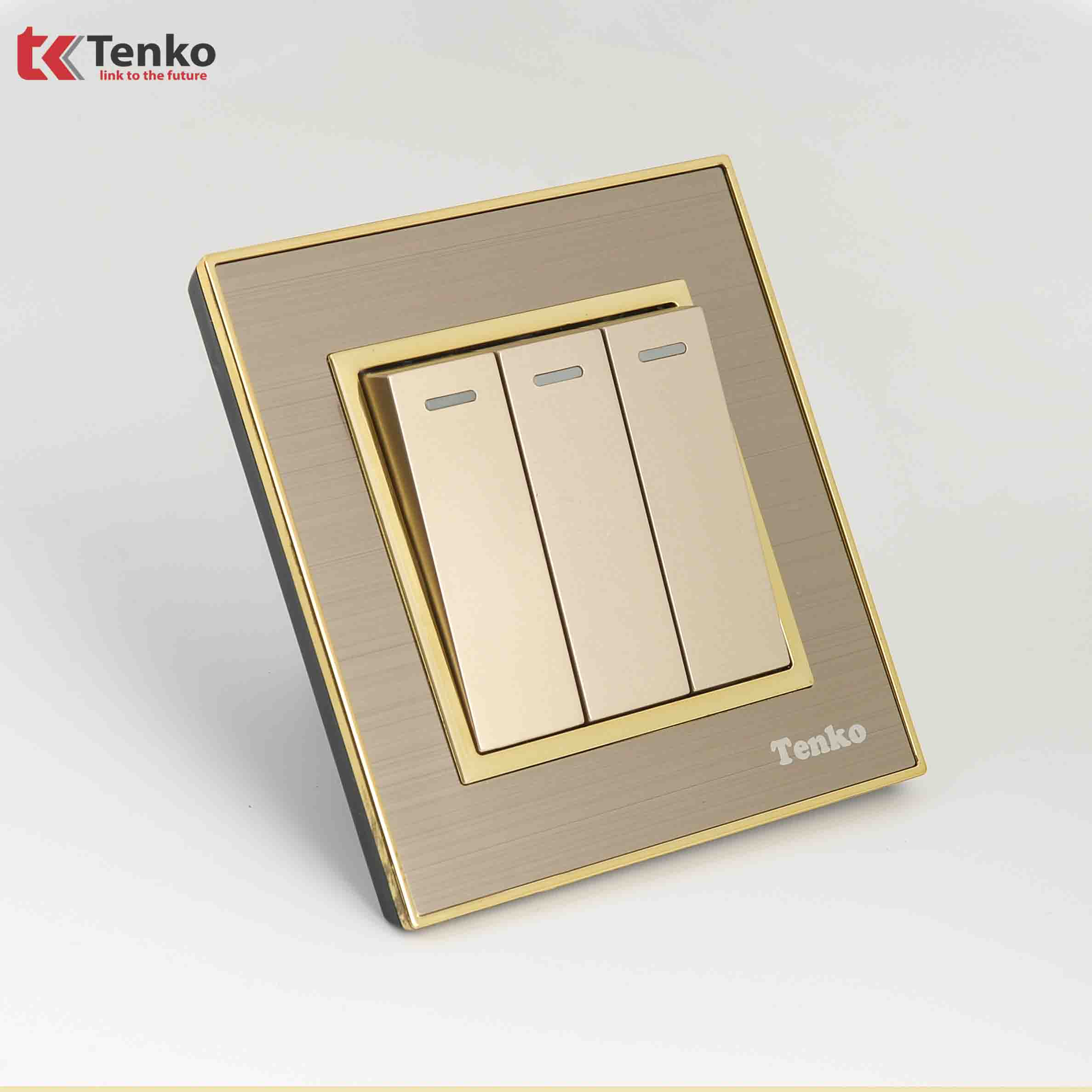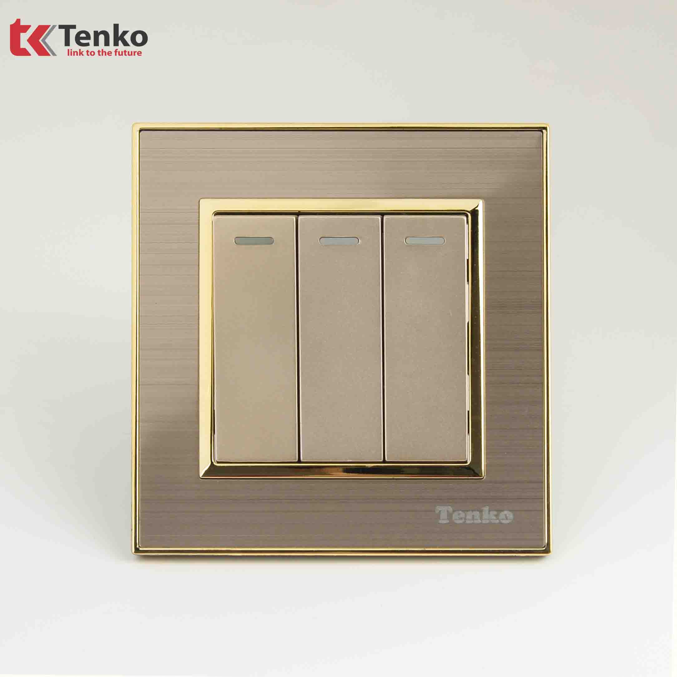 Công tắc 3 nút Mặt Thép Không Rỉ Vân Xước Tenko TK-F66-B9-03 Vàng