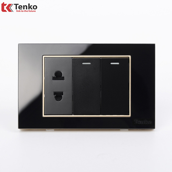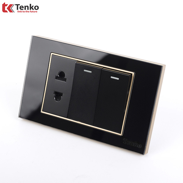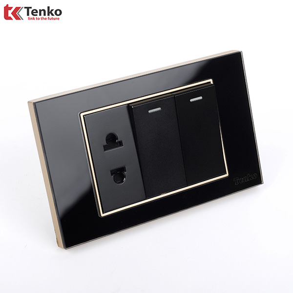 Bộ công tắc, ổ cắm điện âm tường mặt kính cường lực đen viền vàng Tenko TK-C18B-027 là dòng sản phẩm cao cấp nhất của Tenko. Sản phẩm được thiết kế rất tinh tế, sang trọng, hiện đại đạt tiêu chuẩn chất lượng quốc tế. Đây là dòng sản phẩm bán rất chạy trên thị trường. Phù hợp lắp đặt tại các công trình lớn và dân dụng.