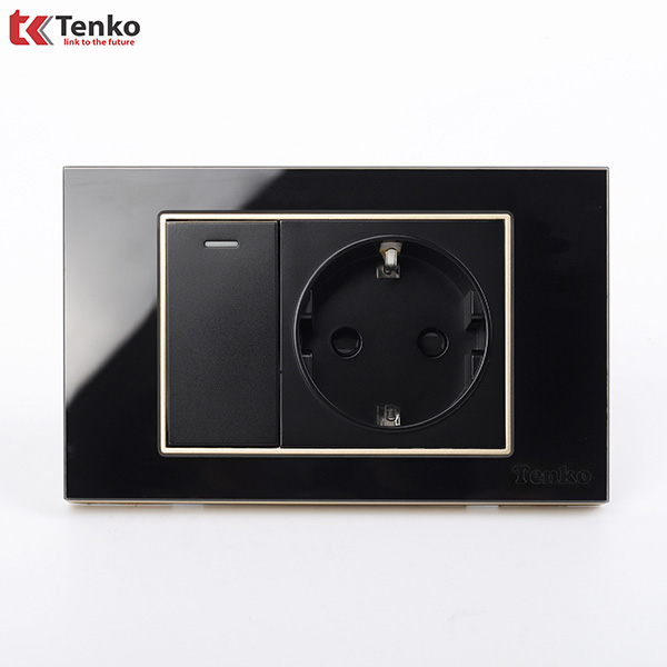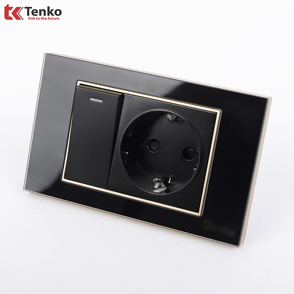Bộ công tắc, ổ cắm điện âm tường mặt kính cường lực đen viền vàng Tenko TK-C18B-059 là dòng sản phẩm cao cấp nhất của Tenko. Sản phẩm được thiết kế rất tinh tế, sang trọng, hiện đại đạt tiêu chuẩn chất lượng quốc tế. Đây là dòng sản phẩm bán rất chạy trên thị trường. Phù hợp lắp đặt tại các công trình lớn và dân dụng.