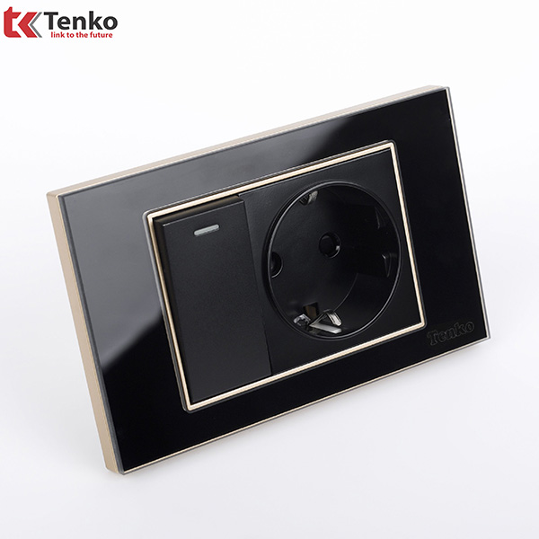 Công Tắc Ổ Cắm Điện Âm tường Mặt Kính Cường Lực Đen Viền Vàng TENKO TK-C18B-059
