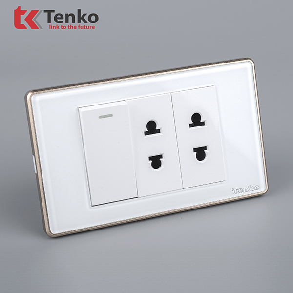 Công Tắc Ổ Cắm Điện Âm tường Mặt Kính Cường Lực Trắng Viền Vàng TENKO TK-C18W-025