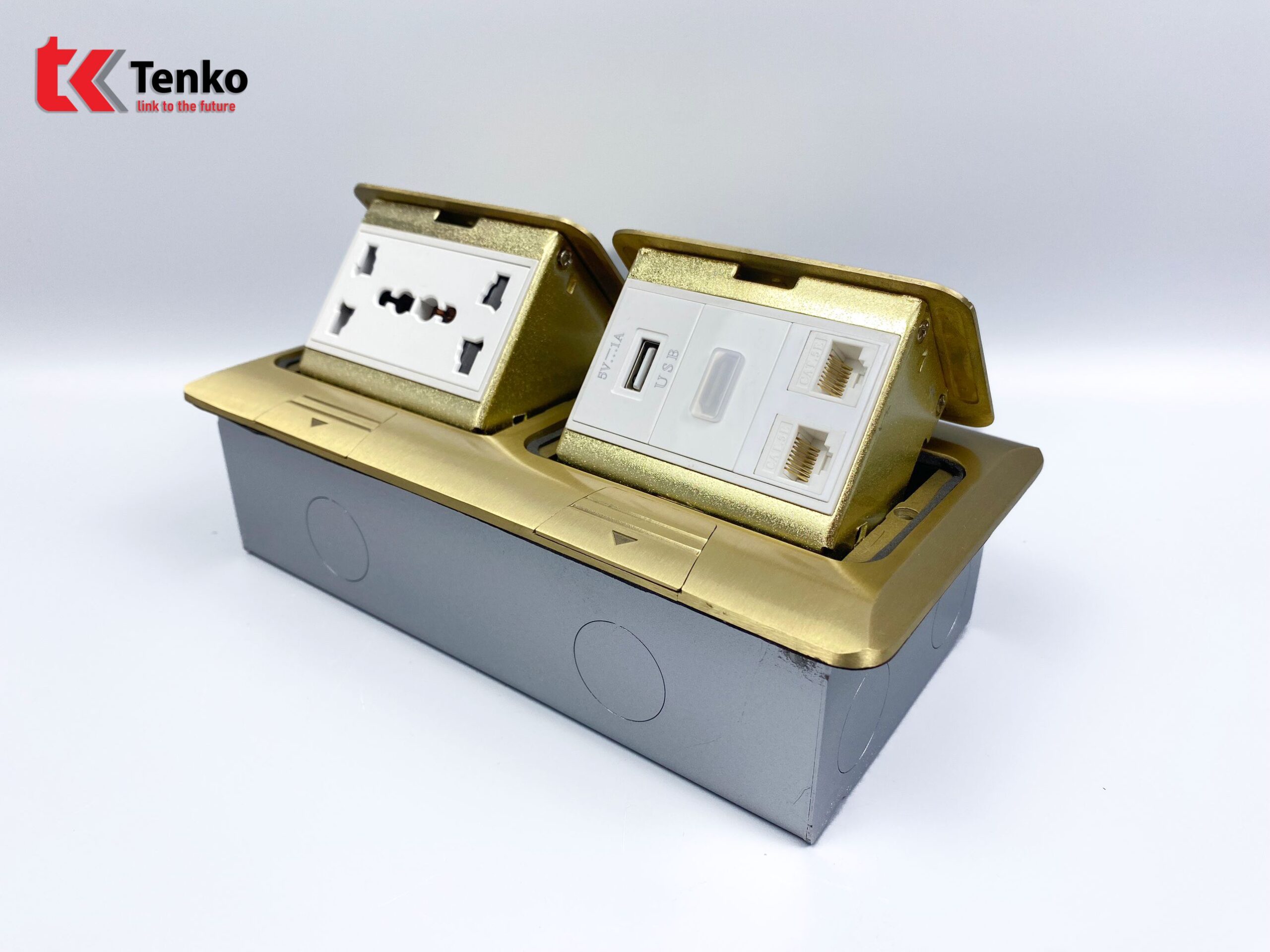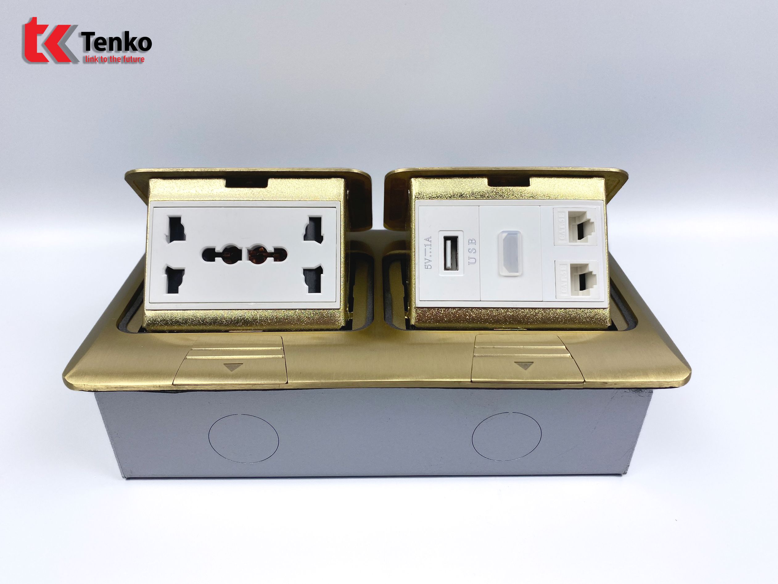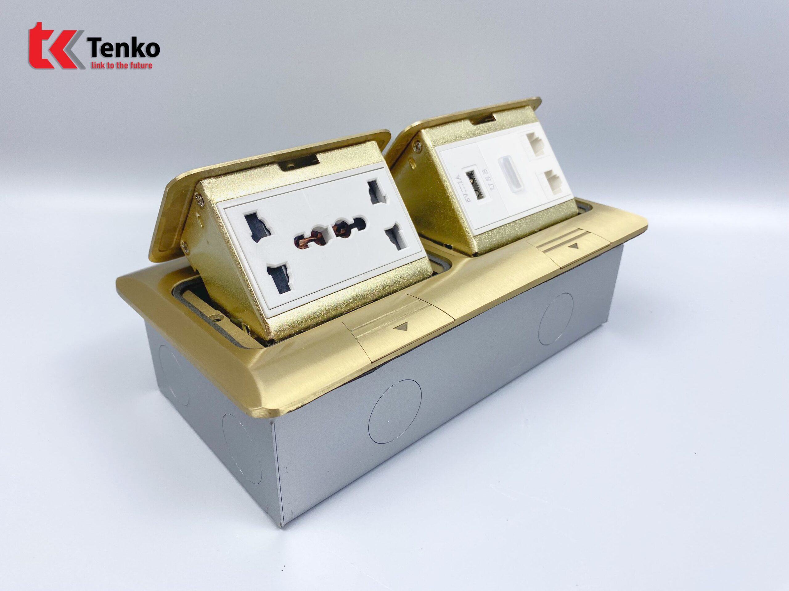 Hộp ổ cắm điện âm sàn kèm mạng LAN, USB và HDMI cao cấp Tenko dòng TK-J04-08 Vàng chất lượng cao được sản suất theo tiêu chuẩn Nhật Bản. Sản phẩm chuyên dùng lắp âm sàn bê tông, sàn nhà, hoặc phòng bếp. Được làm bằng đồng, hoặc Inox, hoặc hợp kim nhôm với thiết kế tinh xảo, vô cùng sang trọng.
