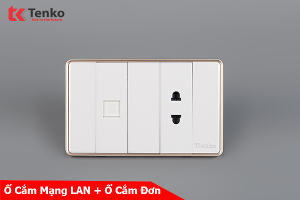 Ổ Cắm 2 Chấu Và Mạng LAN Âm tường Cao Cấp Mặt Tràn Viền TENKO TK-C1-076 Trắng Viền Vàng