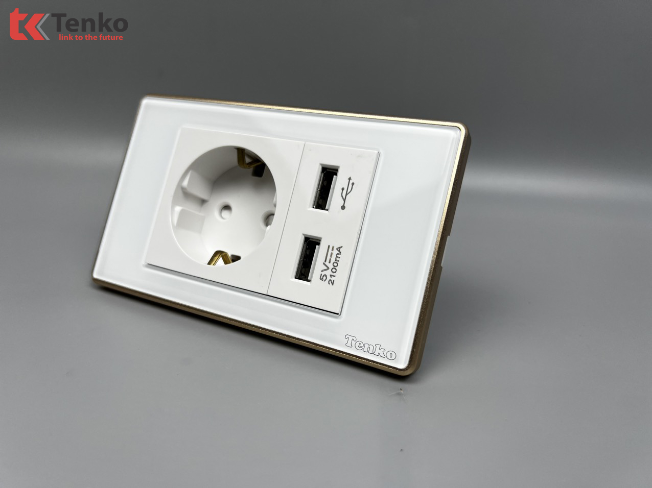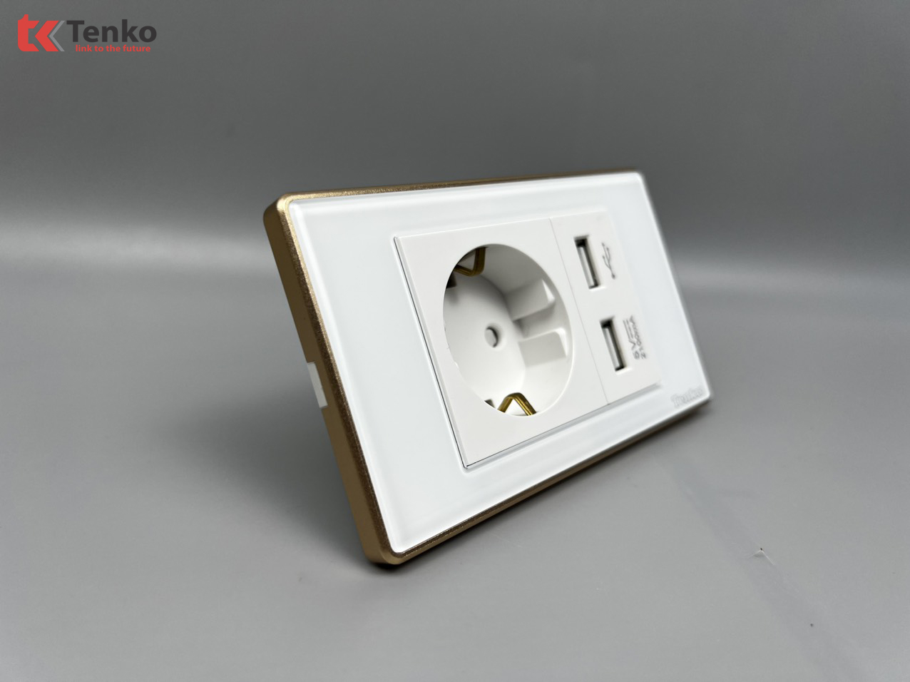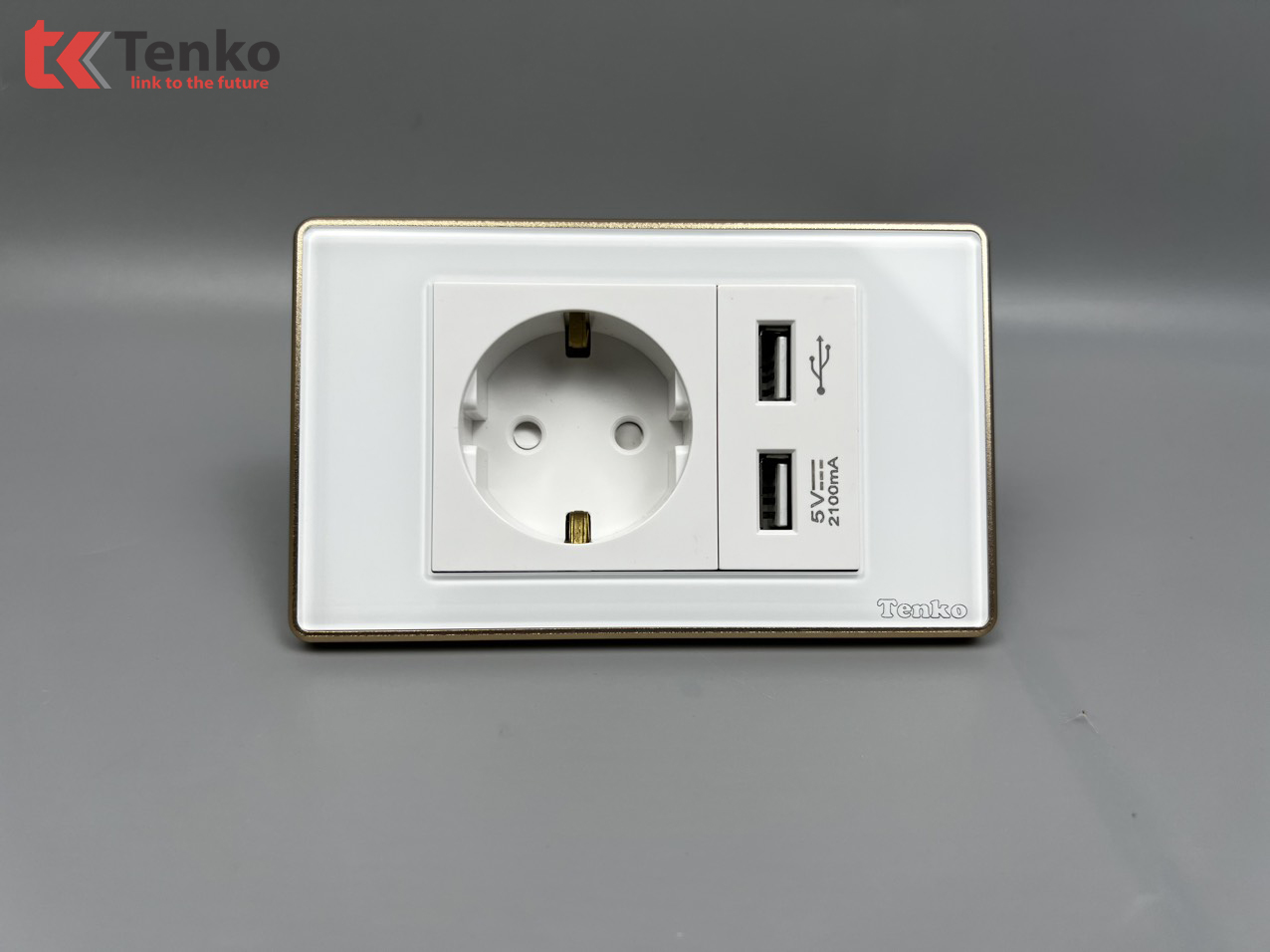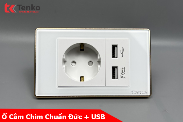 Ổ Cắm Chìm Chuẩn Đức + 2 USB Sạc Nhanh 2100mAh Mặt Kính Cường Lực Trắng Viền Vàng TENKO TK-C18W-065