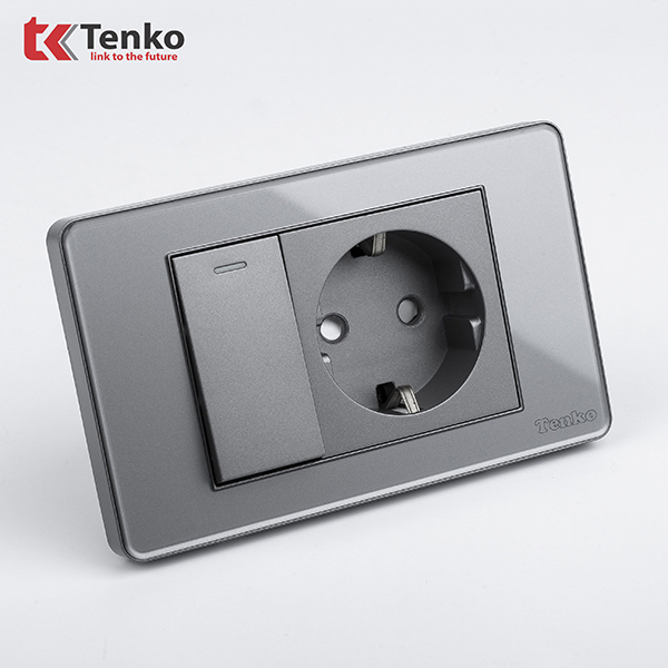 Ổ Cắm Chuẩn Đức Schuko Kết Hợp Công Tắc – Mặt Nhựa Phủ Bóng Epoxy Xám Tenko TK-C9-063