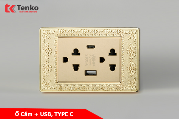 Thông số kỹ thuật Ổ Cắm Điện Đôi 3 Chấu Có USB và Type C Mặt Hoa Văn Đồng Nguyên Khối Tenko TK-C8-045