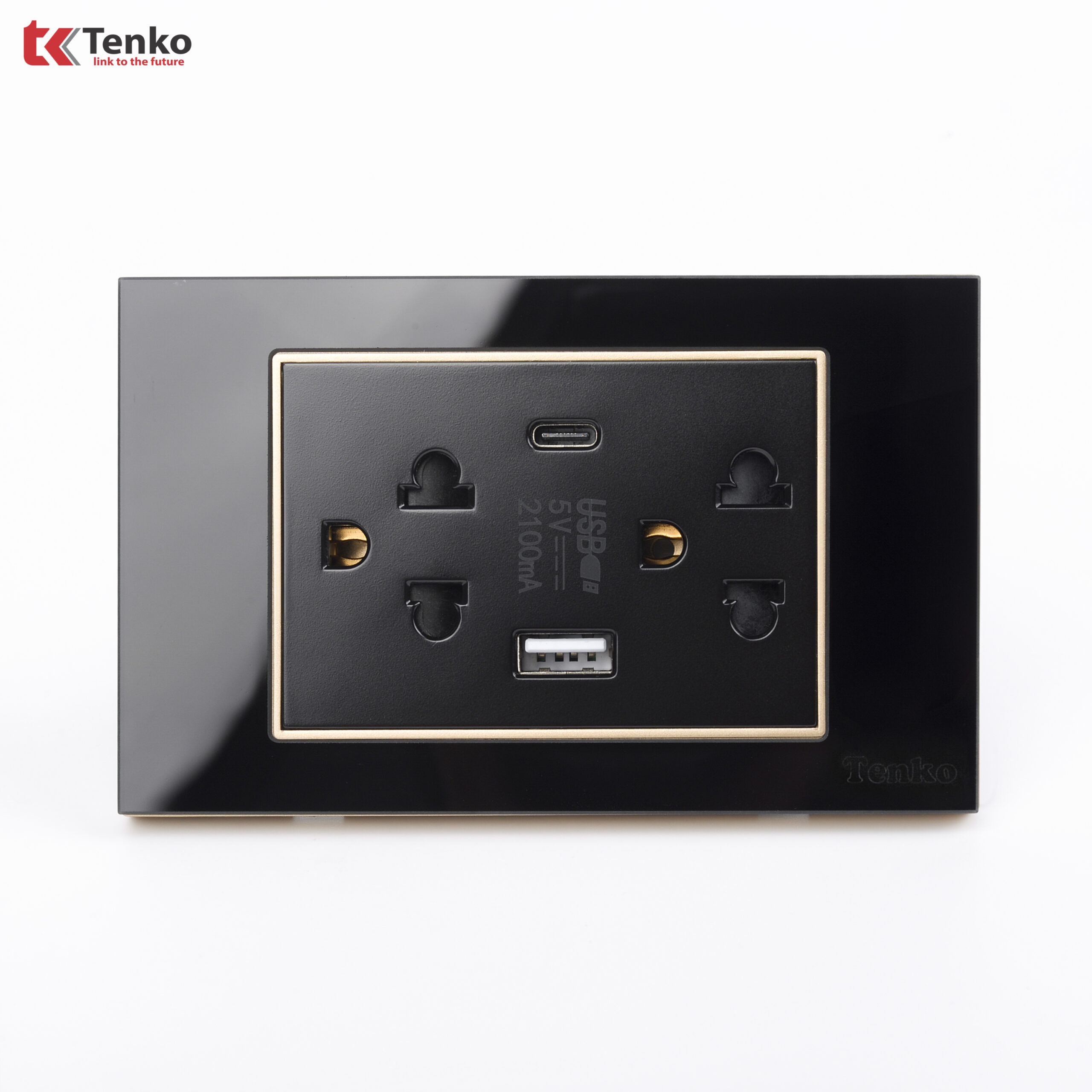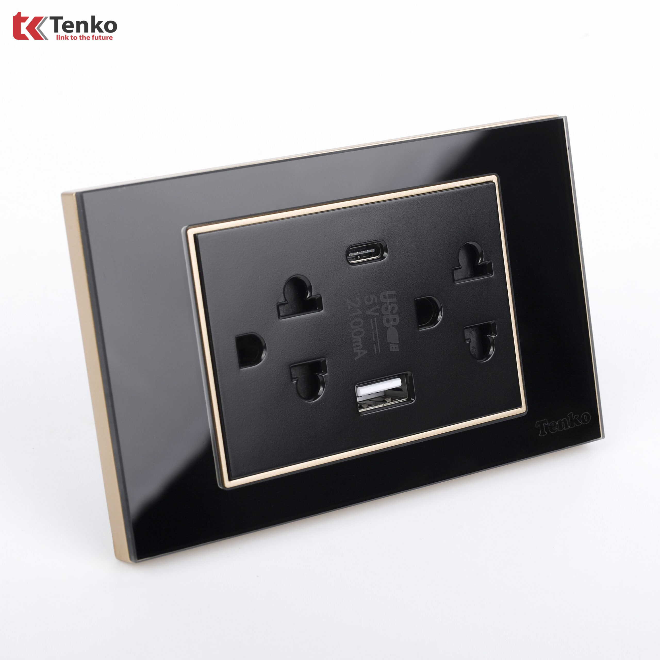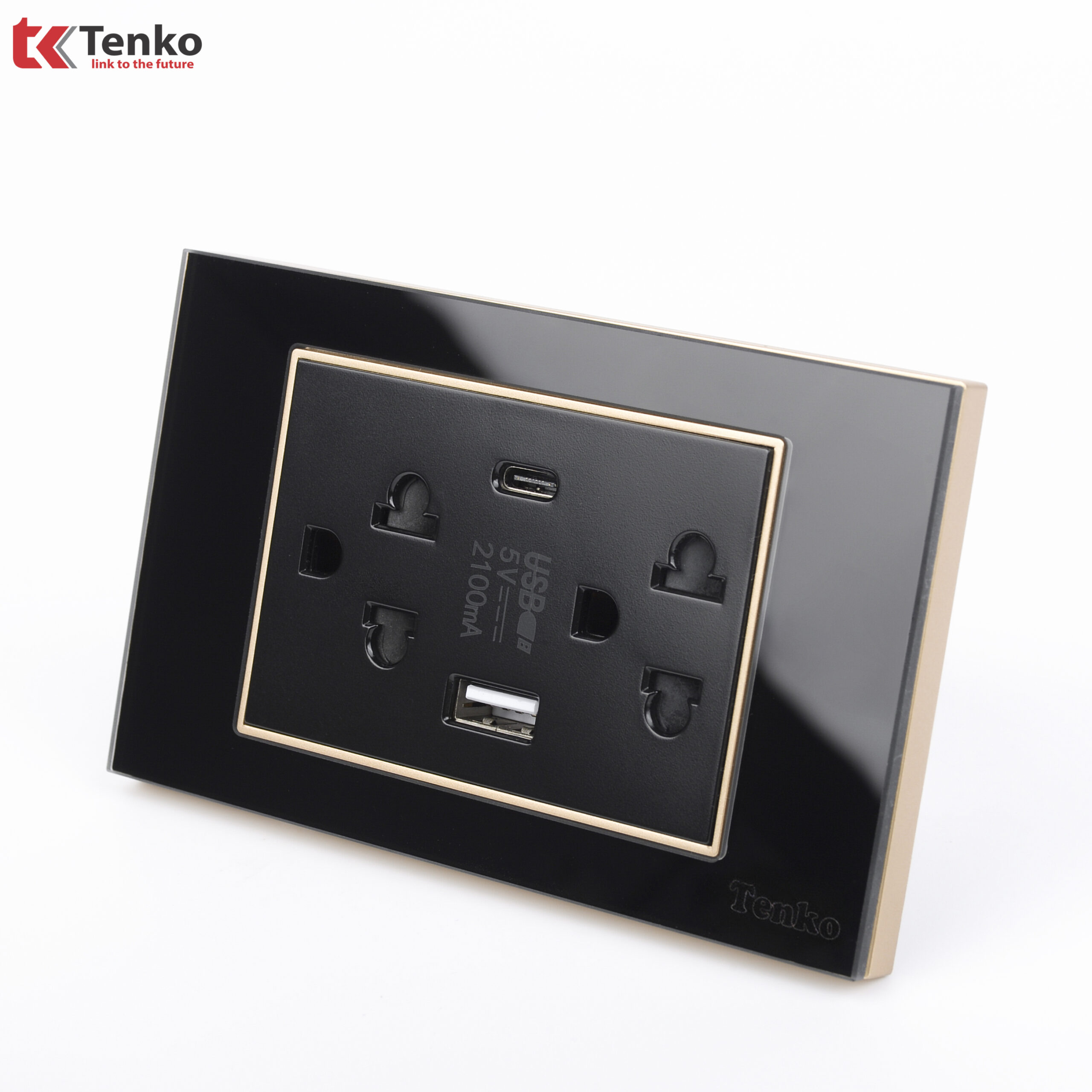 Ổ Cắm Đôi 3 Chấu + USB + Type C Âm tường Mặt Kính Cường Lực Đen Viền Vàng TENKO TK-C18B-045