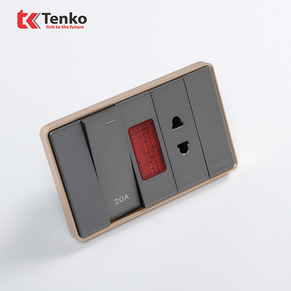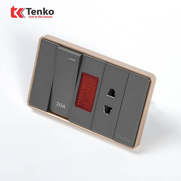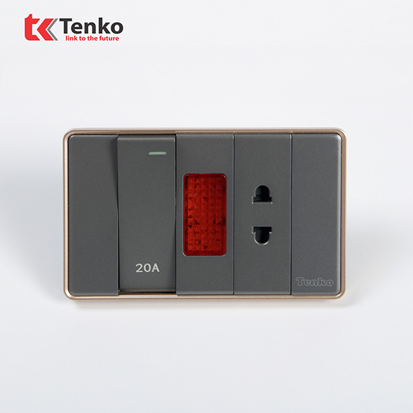 Ổ Cắm Và Công Tắc Điện 20A Công Suất Cao Cho Nóng lạnh Và Điều Hòa Âm Tường Mặt Tràn Viền Tenko TK-C1-080 Xám Viền Vàng