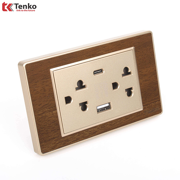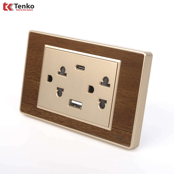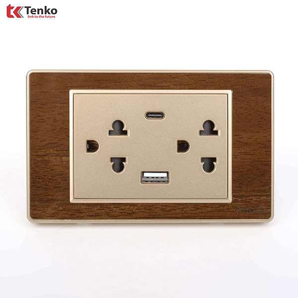 Ổ Điện Đôi 3 Chấu Tích Hợp Cổng USB, Type C Sạc Âm Tường Vân Gỗ Viền Vàng Tenko TK-C6-045USB